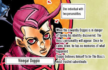 I've been using the term "DID" to describe Diavolo and Doppio's condition up to here, but it's notable that in reality, they're based less on "Dissociative Identity Disorder" than they are "Multiple Personality Disorder". I would not say Diavolo displays anything resembling "dissociating"- it's treated more like a supernatural ability he has, like he has a condition purely built to his advantage. Diavolo's main motivation is to stay hidden, and what's a better way to hide than literally retracting your own body into another?