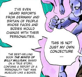 It is my opinion that this case should not be used as inspiration for DID representation at all, let alone the only named example of an individual with DID given. However, unfortunately, Diavolo is not even a unique example of DID in fiction taking after depictions like this. In fact, Milligan's case was a pop culture phenomenon for a long time, spawning plenty of thriller stories inspired by it- which makes all of this even worse to look back on. It's a welcome change that the mention of Milligan ended up being removed entirely in the anime adaptation.