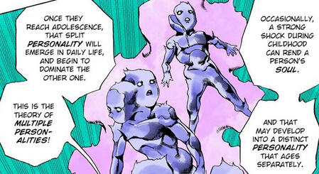 One thing that's striking with Diavolo and Doppio is the very physical way their DID is described and depicted. As souls are a tangible element of a person in the series, DID is explained as when a growing soul sustains so much "shock" in early childhood that it tears while developing and grows into two separate souls instead. DID could be pictured almost like a physical condition here- these souls are in completely severed pieces, able to function and be taken out of the body separately.